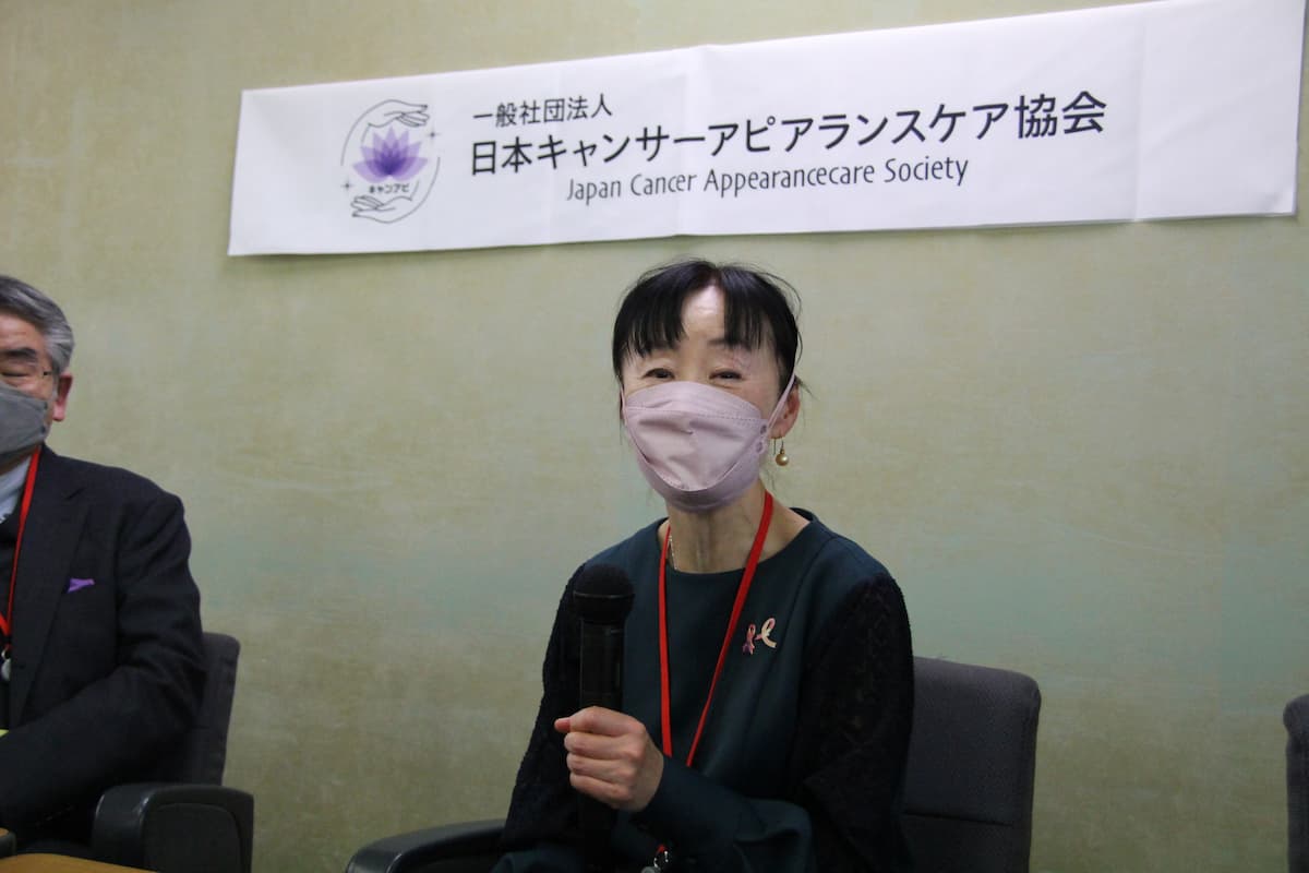 続いて、がんサバイバーであり美容ジャーナリストの山崎多賀子理事より、抗がん剤治療による外見の変化問題について自身の経験を元に話があり、治療を頑張ろう!と思えるアピアランスケアが必要であることが説明されました。