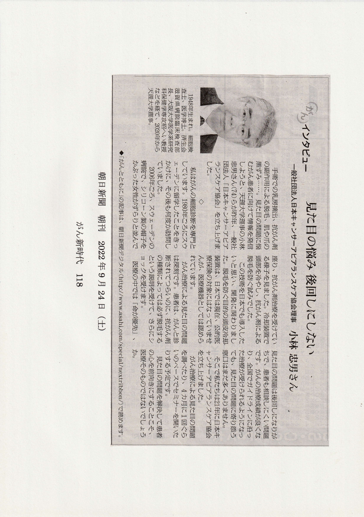 2022年9月24日(土)の朝日新聞「がん新時代」に弊会小林理事の記事が掲載されました。
